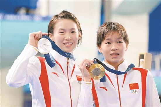 全红婵(右)和陈芋汐展示奖牌 羊城晚报特派巴黎记者 林桂炎 摄