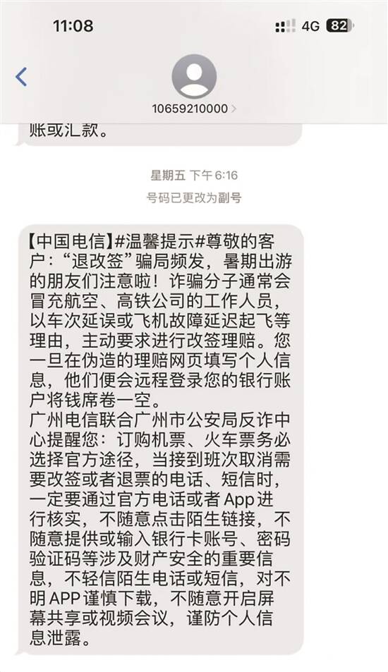电信方面,据郭先生介绍,8月2日、3日,他先后收到了中国电信发来的两条同样内容的短信,提醒警惕“退改签”骗局。原文:“退改签”骗局频发,暑期出游的朋友们注意啦!诈骗分子通常会冒充航空、高铁公司的工作人员,以车次延误或飞机故障延迟起飞等理由,主动要求进行改签理赔。您一旦在伪造的理赔网页填写个人信息,他们便会远程登录您的银行账户将钱席卷一空。“现在回过头来看,电信公司似乎也知晓我的行程。”郭先生梳理了时间线,通过OTA订票、电信公司发来提醒短信(航班起飞前五天)、骗子打来电话(航班起飞前一天)。