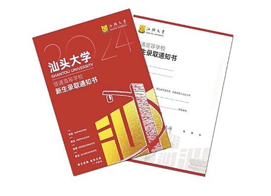 通知书延续本年度招生宣传推开一“汕”窗的主题。正面采用“汕”形窗口作为图案纹理,并融合了桑浦山校区与东海岸校区的标志性建筑,如真理钟、医学楼、图书馆、“大我小我”雕像等,背面将“汕”字进行烫金设计,寓意着新生将以汕大为窗口,打开人生崭新的篇章。随录取通知书发出的还有采用两款随机发出卡套和一套明信片,旨在让新生未进校门就能感受到汕大的美。