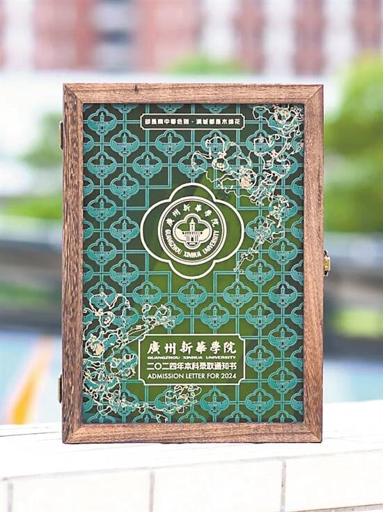 今年的礼盒独具匠心,木盒材质温润厚重,绿金配色传统典雅。礼盒以“英雄花开新征程·新华之窗向未来”为主题。盒面上的精美窗花图案融合了木棉花瓣的形状和广州新华学院的LOGO,形成了独一无二的“新华窗花”纹样。以新华之窗,观世界之景。这是对岭南传统艺术的致敬,以及广州新华“立足湾区,面向世界”精神的生动诠释。礼盒图案设计取自岭南画派代表画家赵少昂先生的作品《木棉小鸟》,礼盒中还随录取通知书附赠学校徽章、新华地图、“致毕业后的自己”信封。