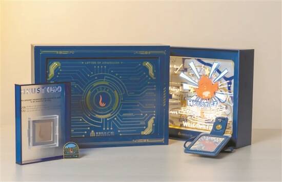 港科大(广州)录取通知书礼盒命名为《探索》。礼盒中有一张特别的“金色薄膜”。这项港科大(广州)科研团队的重磅发明,由世界上最坚韧的超高分子量聚乙烯纳米膜为基体和黄金“融合”而成。金色薄膜仅有头发丝1/300厚度,却具有超过不锈钢25倍的比强度,同时还透明、透气、防水。新生不需要借助显微镜,只用肉眼和手指,就能欣赏和触碰纳米技术的奇妙。把录取通知书的礼盒重新组装,还可以得到专属“校园灯塔”,新生可以在灯片上随意DIY探索目标、课表、心情……寓意着学生在港科大(广州)的每一天都有光。