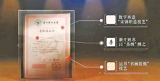 该校录取通知书别具一格,被命名为“锦绣前程”,巧妙融合了“宋锦”“苏绣”与“书画丝绸装裱”三项非物质文化遗产工艺。其中新生名字由非遗传人运用娴熟的苏绣技法手工绣于录取通知书上,一针一线流淌着文化传承与时光芳华,让每一封录取通知书都成为一件独一无二的艺术臻品。