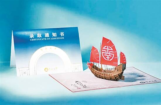 暨大2024年本科录取通知书以海蓝绿、落霞棕、中国红为核心色彩进行设计。在通知书封面上印制了暨大标志性白色拱门,象征着这座百年侨校以博大的胸怀欢迎新生的到来。随通知书寄出的还有“暨南船说”——暨南红船纪念贺卡。打开纪念贺卡,一艘红帆木质红头船样式霎时挺立,船身剪纸工艺细腻精致,加上船头醒目精神的“大眼鸡”,在一方小小的纸面上乘风破浪。