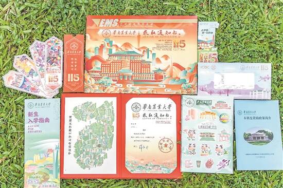 华农的“录取通知书”五字出自著名书法家、动物解剖学家、该校退休教师梁鼎光先生之手。翻至内页,华农主教学区手绘地图映入眼帘,录取通知书页面青山延绵,华农地标建筑错落其间。打开红底金字的校训封套,内含四枚书签,繁花环绕,色彩丰富,设计感十足。还有华农元素满满的贴纸,轻轻一贴,解锁“华农人”的新身份。这份见面礼中还有华农定制校园银行卡与“大学的第一份作业”——开展一次社会实践及阅读一本经典著作。
