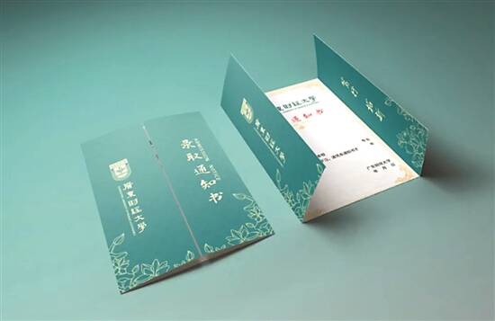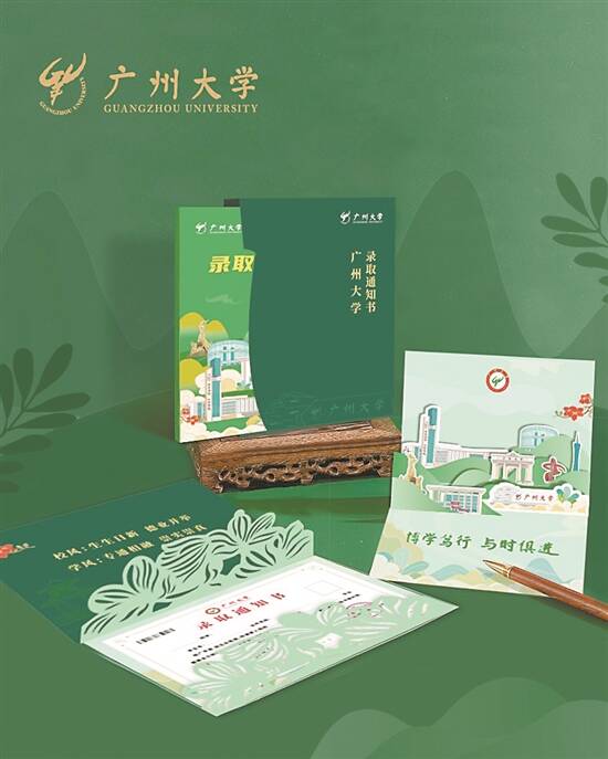 通知书采用封套+立体书的设计,以绿色为主色调,校园标志性建筑立体式嵌入,融合花城元素,尽显羊城风采。翻开封套,立体书缓缓展现,如同推开一扇未知世界的大门。校园标志性建筑和羊城元素,以立体剪影的形式跃然纸上。“博学笃行,与时俱进”,八字校训映入眼帘,从此将其铭记于心,成为一名光荣的广大人。