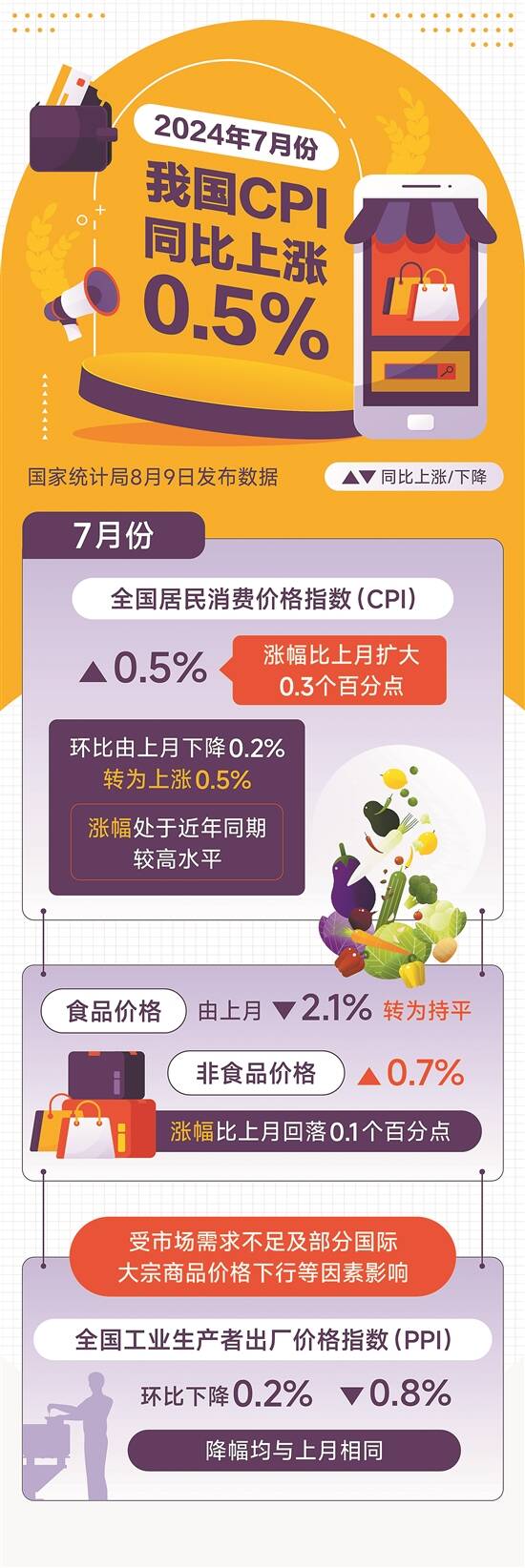 国家统计局9日发布的数据显示,7月份,全国居民消费价格指数(CPI)同比上涨0.5%,涨幅比上月扩大0.3个百分点;环比由上月下降0.2%转为上涨0.5%,涨幅处于近年同期较高水平,国内市场消费需求持续恢复。
