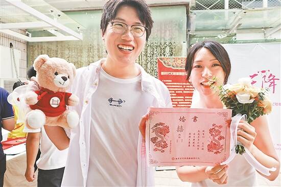 “‘喜从天降’,真的很新颖!”上午10时许,恋爱4年多的“95后”夫妻马女士和沈先生刚领了“红本本”,又拆开了无人机“从天而降”送来的婚书,两人都觉得这一创新、用心的方式,为结婚纪念日再添一重浪漫。除了一束花,作为中山大学校友的马女士还带上了中大百年校庆的文创,“希望能在结婚这天,记录下我和广东、广州的更多故事”。