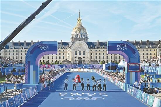 浪漫的宴席不仅如此,奥运竞技场地和城市里的标志性建筑完美结合在了一起:观众可以在举世闻名的埃菲尔铁塔下观赏沙滩排球、在庄重威严的荣军院里观赏射箭、在富丽堂皇的大皇宫里观赏击剑、在宽阔壮观的凡尔赛宫观赏马术比赛、在历史悠久的协和广场观赏滑板……这些场馆是巴黎文化与历史的浓缩,在这里共同见证精彩的竞技赛事,更像是一场跨越时空的演出。自由式小轮车决赛的比赛场馆位于协和广场,深浅不同的紫色赛道充满现代气息,独具匠心的雕塑喷泉和古老的埃及方尖碑是历史的见证,现代运动和古老文物毫不违和,组成了一幅让人挪不开眼的和谐画卷。现场人山人海,连场馆外都站满了观众,这种开放的姿态对于运动员和观众,都是一种特别又新颖的享受,这也真正印证了本届奥运会的口号“奥运更开放”。