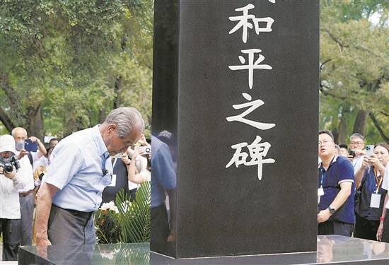 13日,侵华日军第七三一部队“少年队”原队员清水英男(左)在侵华日军第七三一部队旧址“谢罪与不战和平之碑”前忏悔谢罪 新华社发