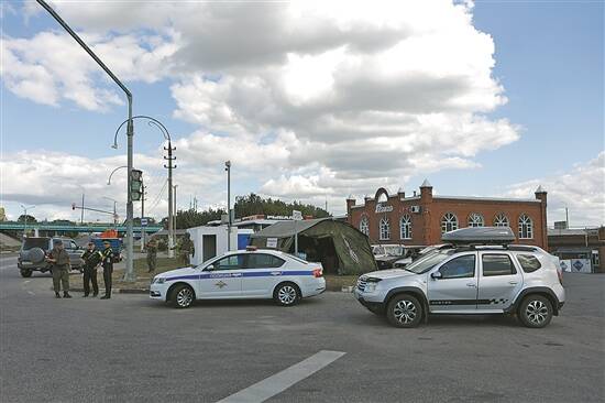 8月12日,在俄乌边境俄方一侧别尔哥罗德州首府别尔哥罗德市,军人和警察在道路旁执勤 新华社发