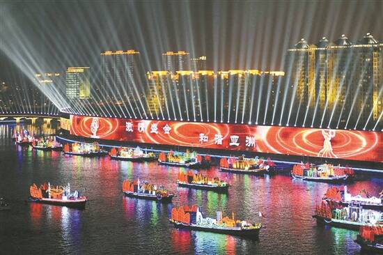 在广州亚运会开幕式的珠江巡游环节中,45艘彩船在头船“南海神号”的带领下,从白鹅潭出发,横跨6座大桥,绵延9.3公里,直达海心沙,亚洲人民实现大团聚。阿富汗的巴米扬大佛、柬埔寨的吴哥窟、印度的泰姬陵、伊拉克的螺旋塔……亚洲不同国家和地区的地标和名胜古迹将45艘彩船装扮得绚烂多姿,在灯光的映衬下,珠江上流光帆影、灿若星河。