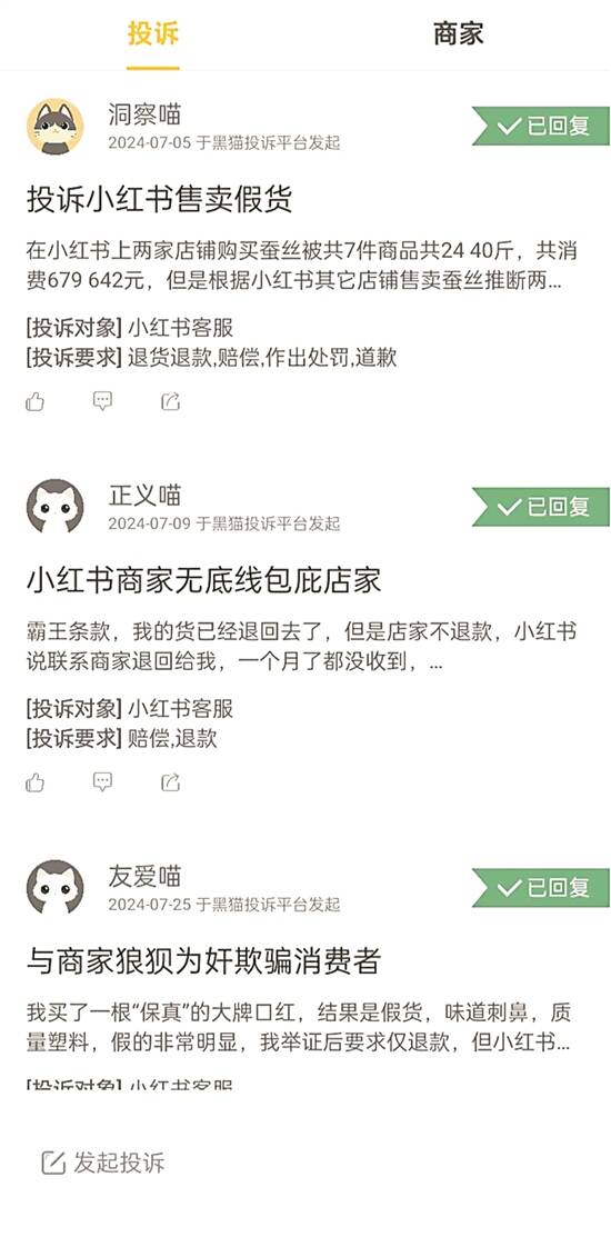 黑猫投诉平台上,用户质疑小红书“包庇”平台商家