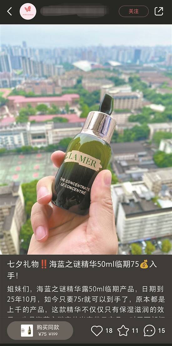 在小红书平台,这股“临期打折”风越吹越烈,已波及众多大牌。“原价1180元的兰蔻小黑瓶精华液临期到手88元”“原价960元的海蓝之谜精粹水临期到手99元”……类似的蓝V店铺不在少数,且涉及CPB、阿玛尼、雅诗兰黛、LAMER等知名大牌,成为吸引消费者的“流量密码”,销量颇高,且过一段时间会以“短期清货完成”为由清空店铺和商品。