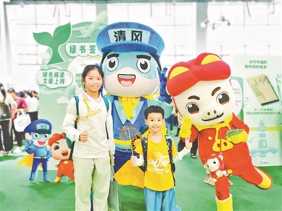 在书展现场,广州市“扫黄打非”形象IP“清风侠”和动漫明星“猪猪侠”人偶所在的“护苗2024·绿书签行动”展台,受到众多小朋友的青睐。