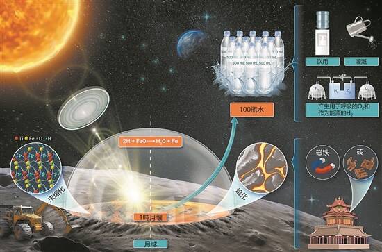 基于上述研究成果,研究团队进一步提出一种“熔融月壤—水蒸气冷凝成水收集储存—电分解水产生氧气和氢气—留存的铁和月壤用作永磁和软磁材料、电子材料、建筑材料等”的月球水资源原位开采与利用策略。研究人员表示,该策略将为未来月球科研站以及空间站建设提供重要的设计依据,并有望在后续的嫦娥探月任务中发射验证性设备以完成进一步确认。