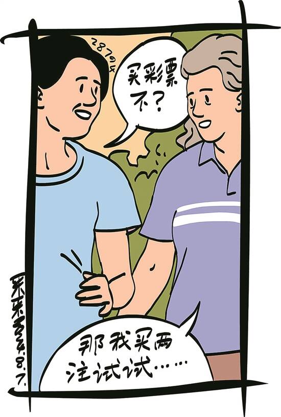 太阳升得老高了,刘姨走在前面,回头望了眼张姨:“买彩票不?”张姨迟疑了一下回答:“那我买两注试试。”两人散步来到小河边,一边做着伸腿之类的简单动作,一边弯下腰来捡拾纸片等。看时间不早,刘姨提议先到投注站把彩票买了,然后到菜市场买菜。张姨一脸疑惑地问:“那我选什么号码呢?”