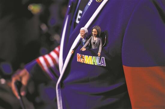 当地时间8月19日,美国民主党全国代表大会上,与会者胸前佩戴拜登、哈里斯人偶 视觉中国供图