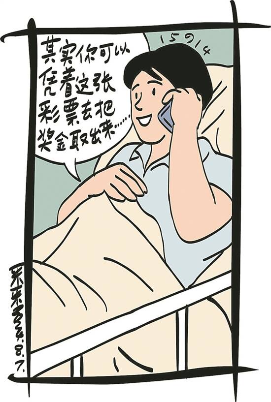几天后,躺在医院病床上的大明,让弟弟给徐叔的彩票投注站送去了一面锦旗。与平时一些人送的不同,大明送的这面锦旗上写着这样两行字——“感谢徐叔:这一百零八通电话,足以证明你的诚信。”