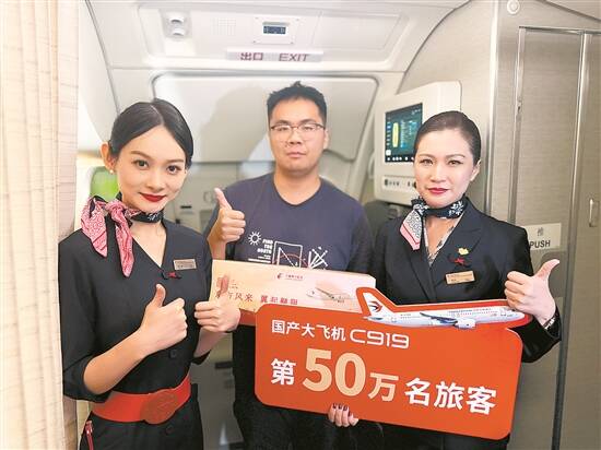 羊城晚报讯 记者李志文、通讯员东宣报道:“祝贺您幸运地成为国产大飞机C919第50万名旅客!”9月1日,MU9188“成都天府—上海虹桥”航班上,旅客陆先生收获了这份独具价值的惊喜与祝贺。由此,C919自2023年5月28日投入商业运营以来,已累计安全飞行超1万小时,执行商业航班超3700班、承运旅客突破50万人次大关。东航作为国产大飞机C919的全球首发航司,当天为幸运旅客送上了由机长、乘务长签名的东航全球首架C919飞机模型,东航人与旅客共同祝福国产大飞机“越飞越好”。