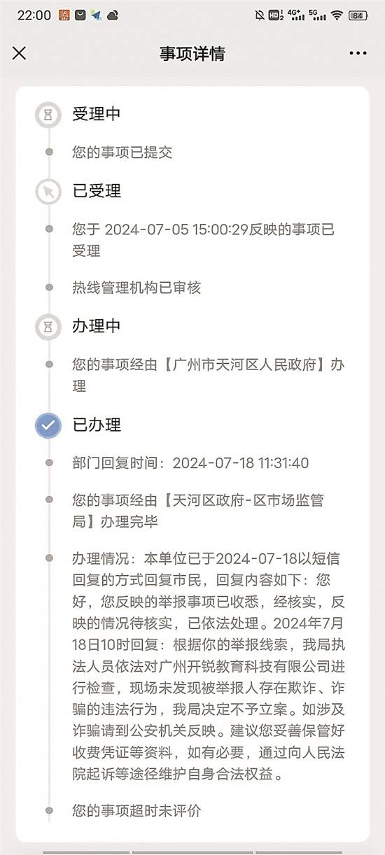 8月,徐女士再次投诉,9月2日得到广州市天河区市场监督管理局兴华市场监督管理所(以下简称“天河区兴华所”)的不立案通知,原因是该部门执法人员在8月30日对广州开锐教育进行检查,发现其不在注册地经营,将该公司拟列入经营异常名录。
