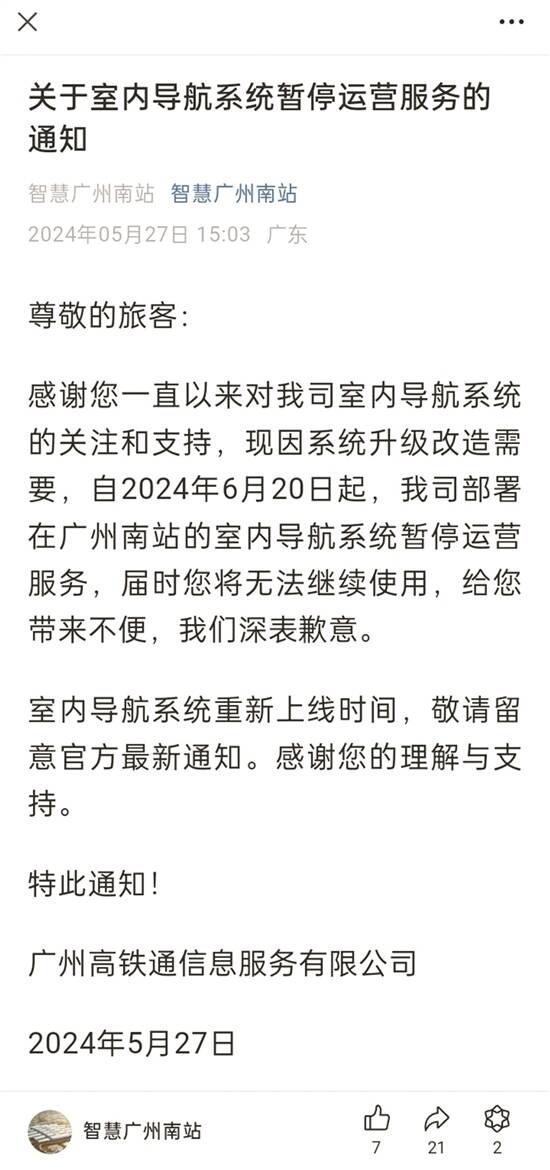 9月5日,记者就为何会关闭“广州南站室内导航系统”向广州南站了解情况,截至发稿前,暂未收到回复。