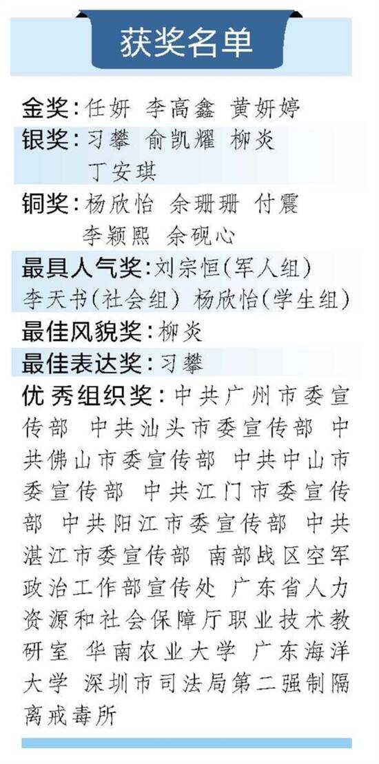 羊城晚报讯 记者丰西西报道:9月10日,由广东省委宣传部、广东省直机关工委、广东省教育厅、广东省人力资源和社会保障厅、广东省退役军人事务厅、广东省军区政治工作局、广东省总工会、共青团广东省委员会、广东省妇女联合会联合主办,广东广播电视台、羊城晚报共同承办,广东网络广播电视台承制的“迈向新征程·同心铸国防”广东省全民国防教育主题宣讲比赛总决赛在广州举办。主办、承办单位相关同志,参赛选手及亲友团,英模代表、媒体记者、学生代表等约300人出席活动。