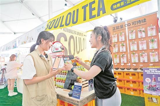 马来西亚游客在绿色集市用自己手机上的马来西亚钱包,尝中国茶