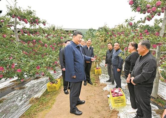 9月10日至13日,中共中央总书记、国家主席、中央军委主席习近平在甘肃考察。这是11日上午,习近平在天水市麦积区南山花牛苹果基地考察时,走进果林了解相关种植、技术和管理情况 新华社发