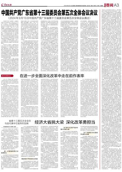 9月13日,中国共产党广东省第十三届委员会第五次全体会议在广州召开。企业经营者、科研院所负责人、科技人才代表、“三农”方面专家学者、省内重要文化机构负责人等涉及重要改革的有关方面代表列席会议。