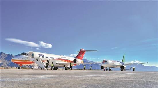 羊城晚报讯 记者李志文报道:9月19日,中国商飞公司一架C919飞机从四川成都双流国际机场起飞,经过2小时8分钟飞行,平稳降落在西藏拉萨贡嘎国际机场。这是C919首次飞抵拉萨,与正在进行演示飞行的ARJ21飞机相聚在“世界屋脊”青藏高原。