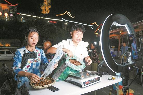 晚上八九点,在湖南省湘西土家族苗族自治州花垣县十八洞村,村里的感恩广场一片火热。“95后”主播施康站在感恩广场,面对镜头卖力推荐村里的包谷酸、黄豆等农副产品。直播结束后,施康用略带沙哑的声音说:“我是在村里长大的孩子,要继续努力,把十八洞村建设得更好。”
