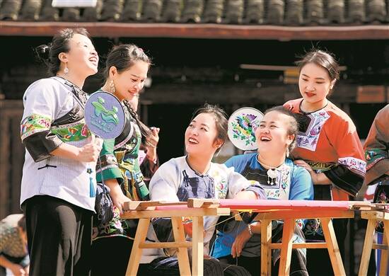 中国妇女第十三次全国代表大会召开前夕,十八洞村的绣娘们一起绣制作品 受访者供图(资料图)