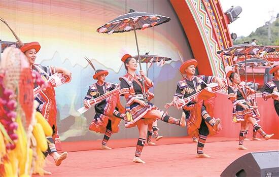 开幕式现场,奔放的长鼓舞和独具民族风韵的民间舞蹈先声夺人,莎腰妹与阿贵哥身着节日盛装,尽显瑶族特色文化的传统风格。