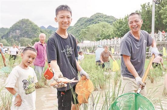 “捉到啦!捉到啦!”随后,逾万名游客和群众冲入三江河里,开启抓鱼大战。游客群众手持各种捉鱼工具在河中搜寻肥美的生猛鱼群,纵享自由捕扑的渔趣,场面欢乐热闹。