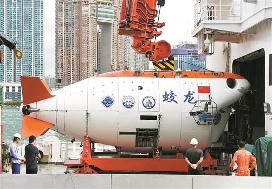 停靠于香港尖沙咀海运码头的“深海一号”远洋科考船上的“蛟龙号” 新华社发