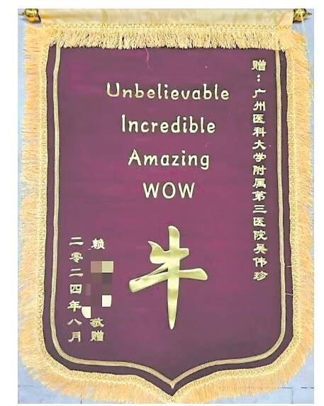 “这可能是我收到最直接、最‘牛’的锦旗了!”近日,广州医科大学附属第三医院(以下简称“广医三院”)产科三区护士长吴伟珍收到了市民赖女士送的锦旗。锦旗正中间写着一个大大的“牛”字,上方还带有“Unbelievable(难以置信的)”“WOW”等英文(见图),表达着赖女士对医护人员的感谢与赞赏。吴伟珍说:“看到锦旗就好像收到了个大大的拥抱。”