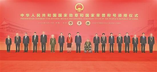 9月29日,中华人民共和国国家勋章和国家荣誉称号颁授仪式在北京人民大会堂金色大厅隆重举行。习近平等领导同志同国家勋章和国家荣誉称号获得者合影留念