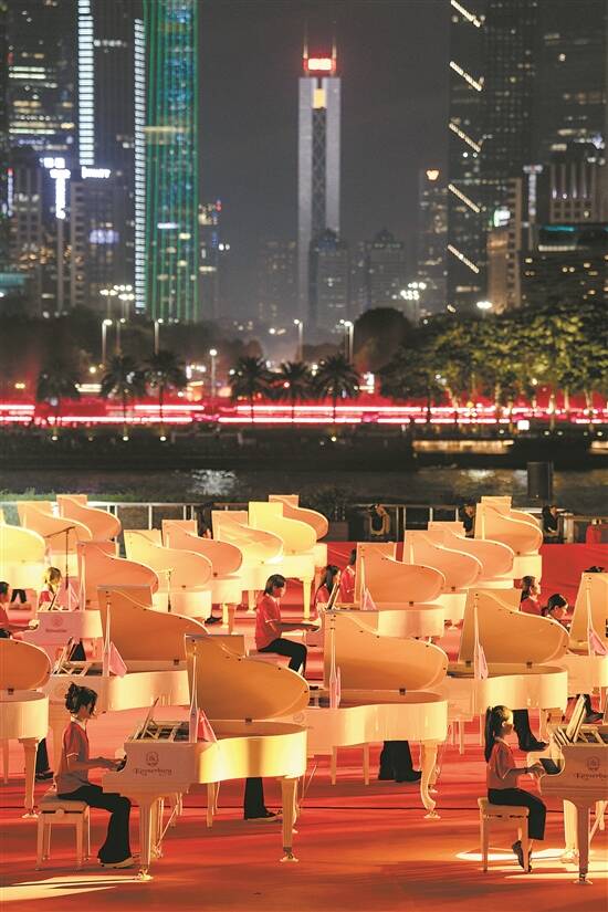 羊城晚报讯 记者罗仕、通讯员穗宣报道:29日晚,“湾区百琴颂中华”大型传唱会在广州举办。100台三角钢琴在广州塔下呈现“75”字样,1000多名群众现场奏唱国歌,并以传唱爱国歌曲的形式热烈庆祝中华人民共和国成立75周年。