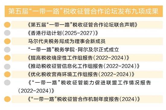 前4届合作论坛累计发布《乌镇行动计划(2019—2021)》《努尔苏丹行动计划(2022—2024)》等20项重要成果。在刚刚结束的第五届合作论坛上,与会各方达成一系列广泛共识,并发布《第五届“一带一路”税收征管合作论坛联合声明》《香港行动计划(2025-2027)》等九项重要成果。合作论坛深化了各国税务部门间的交流互鉴,进一步推动完善透明、高效、稳定、可预期的税收合作机制。