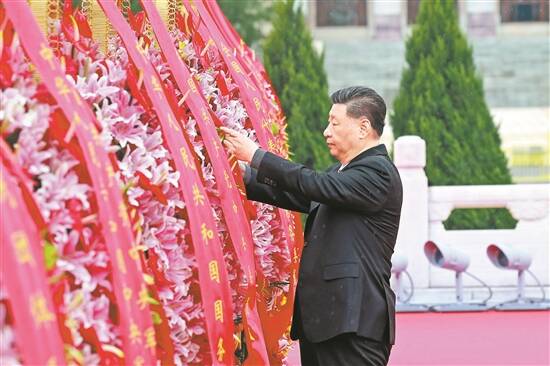 习近平迈步上前,仔细整理花篮缎带。随后,习近平等党和国家领导人缓步绕行,瞻仰人民英雄纪念碑。