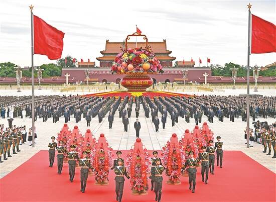 壮阔的天安门广场上,鲜艳的五星红旗迎风招展。广场中央,“祝福祖国”巨型花篮表达着对祖国繁荣昌盛的美好祝福。巍然耸立的人民英雄纪念碑北侧,两组花坛上镶嵌着白菊等鲜花组成的18个花环,寄托着全体中华儿女对英烈的深切缅怀。