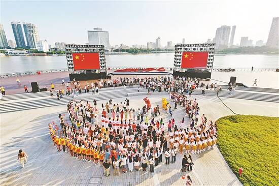 10月1日早上,广州白鹅潭大湾区艺术中心的户外广场传来一阵悠扬的歌声,为这一天拉开了朝气蓬勃的帷幕。超过300位来自体育界、文艺界、教育界、文化界人士聚在一起,共同唱响爱国歌曲《今天是你的生日》,以一场别开生面的快闪活动庆祝中华人民共和国成立75周年。