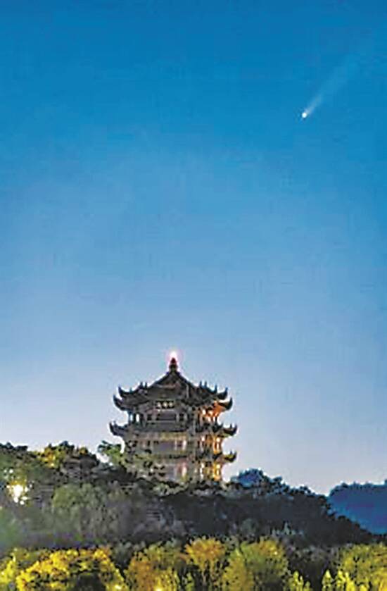C/2023A3(紫金山-阿特拉斯)彗星绕地球运行周期约61751年,10月12日它将达到本次周期中离地球最近的轨道位置。图为9月29日紫金山-阿特拉斯彗星与武汉黄鹤楼同框 图/视觉中国