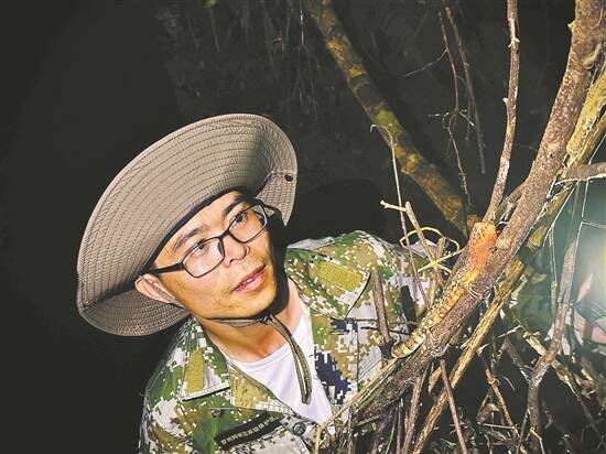 野外的鳄蜥溪沟是蛇虫出没最频繁的地方,在调查中经常会忽然发现一条蛇挂在头上的枝条或者匍匐在脚边的石头上,但是何南毫无畏惧,有时候为了充分掌握鳄蜥的活动节律,凌晨5点就守在鳄蜥溪沟里直到晚上9点,一动不动防止惊吓到鳄蜥。
