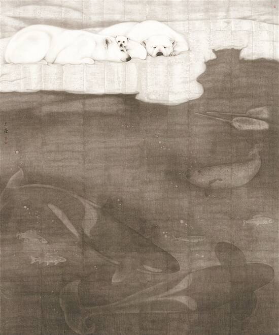 《休戚与共》是这一系列的创作之一。极地生态的平衡关系着人类前途与未来,此作品意在突出北冰洋生态圈的祥和景象,希望以此引发人们对生态保护的关注。