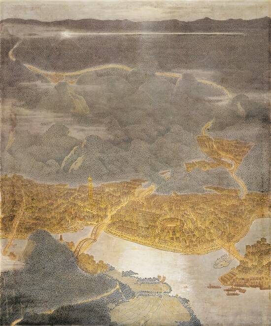 如果说《第聂伯河上的月夜》表现了某种深邃的宁静,那么我们的这幅作品更想表现改革开放后,家乡城市的繁华璀璨。为了和西画表现的光色区分出来,我们经过多次实验,后用绢本和金、银箔的传统材料与技法去表现闪烁的灯光与月色倒影,又用撞水积染技法来处理夜色里郁郁葱葱的森林,最后一层一层反复薄染表现出夜色朦胧和湿润感。