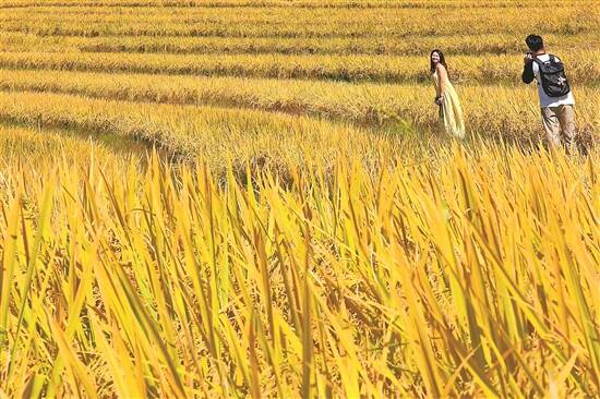 10月4日,连山壮族瑶族自治县太保镇漫山遍野的水稻成熟了。秋风轻拂,饱满金黄的稻穗随风摇曳,稻浪奔流,引来众多途人驻足流连。