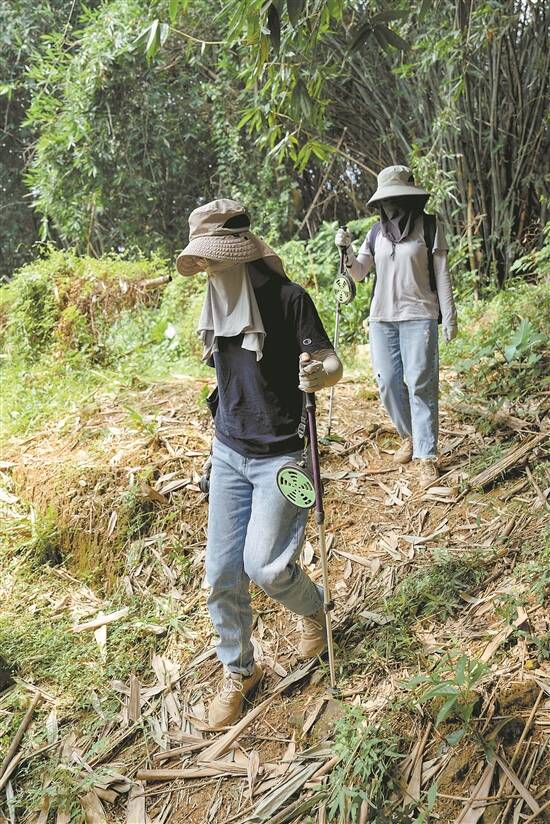 气候炎热,为了防止被晒伤,王欢和同事纷纷“全副武装”。其中,两位年轻小姑娘更是把自己包裹得严实,防晒帽、冰袖、登山鞋等户外装备通通用上,只露出一双眼睛。她们还将点燃的蚊香盒挂在登山杖上,用来驱赶蚊虫。
