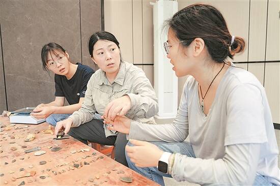 西樵山下的岭南考古遗存修复保护研究中心内,王欢(右二)和同事们测量着平面岗遗址出土的石器