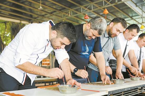 外国游客团成员体验中国传统技艺香云纱的制作工艺 广州南沙区文广旅体局供图